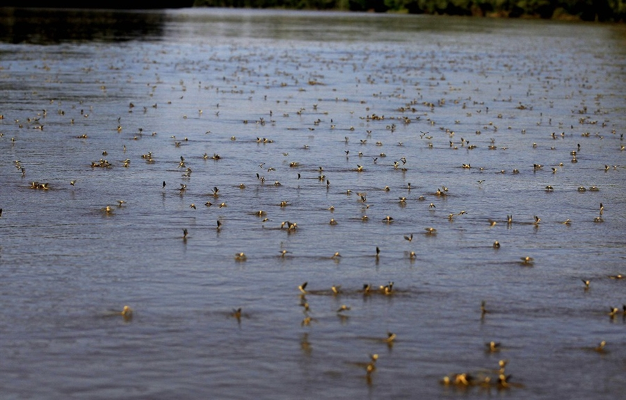 首先我们要说,蜉蝣成虫一般都是成群出现,而这也是它们的无奈之举。原来啊,蜉蝣力量实在是太渺小了,根本没有任何自保能力。而且,它们的飞行速度并不快,当它们贴着水面飞行时,鱼类会跃出水面吞食它们,当它们在空中飞行时,鸟类也会把它们当做是食物的来源。比如:在此次河南邓州蜉蝣大爆发时,就吸引了成百上千只黑鸟的注意,这群黑鸟就是来捕食它们的。